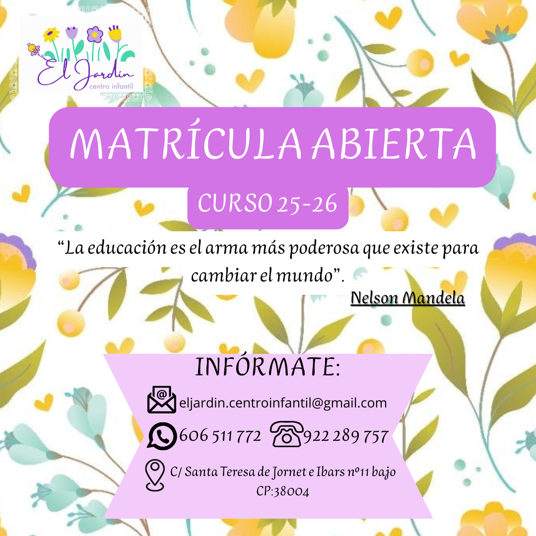 El Jardín es un centro de educación infantil en Santa Cruz de Tenerife que abrió sus puertas 1982 por lo que lleva una trayectoria de más de 40 años en activo. En la actualidad, dirige el Centro Ana González hija de la que fue directora durante casi toda la trayectoria del Centro.